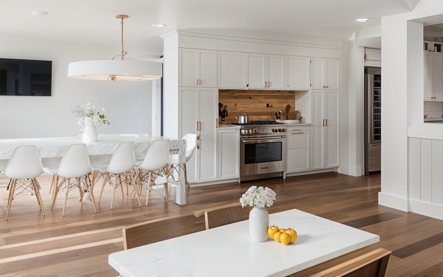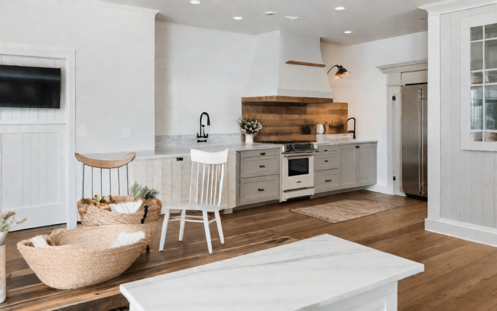 • White for a Balanced Bite: Softer whites counterbalance the wood, adding a modern touch and that inviting farmhouse feel.