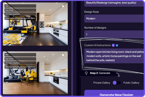 Get Mode Control over your full image redesigns. With Custom AI Instructions, you can control the direction of our AI when using our full image redesign modes (Beautiful Redesign & Creative Redesign). You can use this feature to add specific colors, textures, or extra elements to your designs until they match your vision.